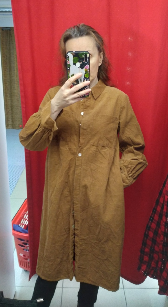 Здравствуйте, продолжу обзор с акции "всё по 50 рублей". В этот раз очень много размера М осталось, что для меня обидно. Находила я несколько прекрасных вариантов, но велико, всё мимо, а при такой смешной цене это обидно вдвойне(( Платье-рубашка с накладными карманами, сшито из вельвета, цвет коричнево-золотистый, очень приятный. Платье понравилось, но 38 размер мне велик, мотается на мне как на вешалке. А ведь отличный вариант на прохладное лето, на демисезон тоже. Состав хорошего вельвета из 100% хлопка. Все-таки в последнее время очень часто вельвет с большой долей синтетики бывает. Есть запасная пуговица. Трикотажное платье. Люблю плотный трикотаж, но это платье очень узкое, хотя размер мой. Бывают плотные компрессионные чулки, вот я себя и чувствую как в таком чулке. Хотя всё равно не мой рост, талия убежала. Много золотых блестящих пуговиц, они есть и на плечах, на рукавах. Не пуговицы, а зеркала, я в них прекрасно отражаюсь)) Прямое платье с рукавами 3/4., на спинке молния. Ви