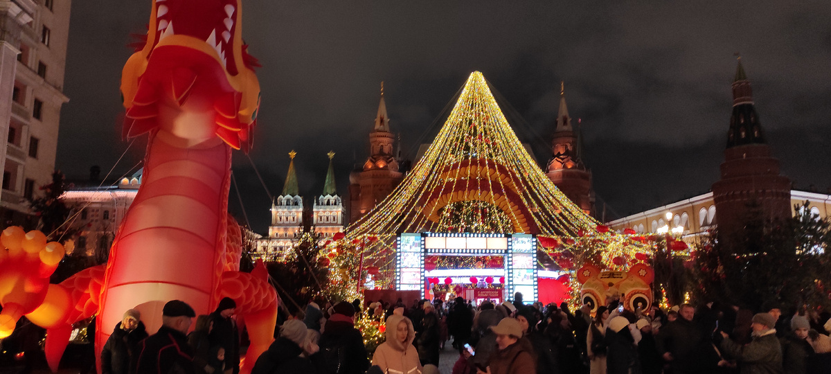 Охотный ряд, расположенный в самом центре Москвы, стал одной из главных площадок для проведения праздничных мероприятий. Площадь украшена традиционными китайскими фонариками, красными драпировками и символическими фигурами змей, создавая атмосферу настоящего восточного праздника.