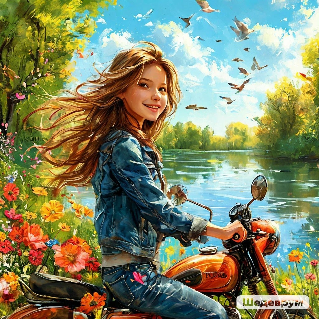 На переднем плане изображена девушка, сидящая на своем байке. Она наслаждается свежим воздухом и солнечными лучами. Её волосы развеваются на ветру, а на её лице — улыбка счастья. Вокруг нее яркие весенние цветы, которые добавляют радостных красок в композицию. На заднем плане виднеется спокойная река, сияющая под лучами солнца. Вода блестит, создавая легкие волны. На противоположном берегу можно увидеть зелёные деревья, а также несколько птиц, которые летают над рекой. Небо чистое и голубое, с несколькими пушистыми облаками. В общем, картина передает атмосферу свободы и гармонии с природой. Миф о девушке на мотоцикле у реки является одной из популярных тем в байкерской культуре. Он описывает красивую девушку, которая ездит на мотоцикле по реке или озеру, а ее волосы развиваются на ветру. Она выглядит очень привлекательно и грациозно, и заставляет всех мужчин смотреть на нее с восхищением. Однако, этот миф не имеет никаких исторических или реальных доказательств. В действительности,