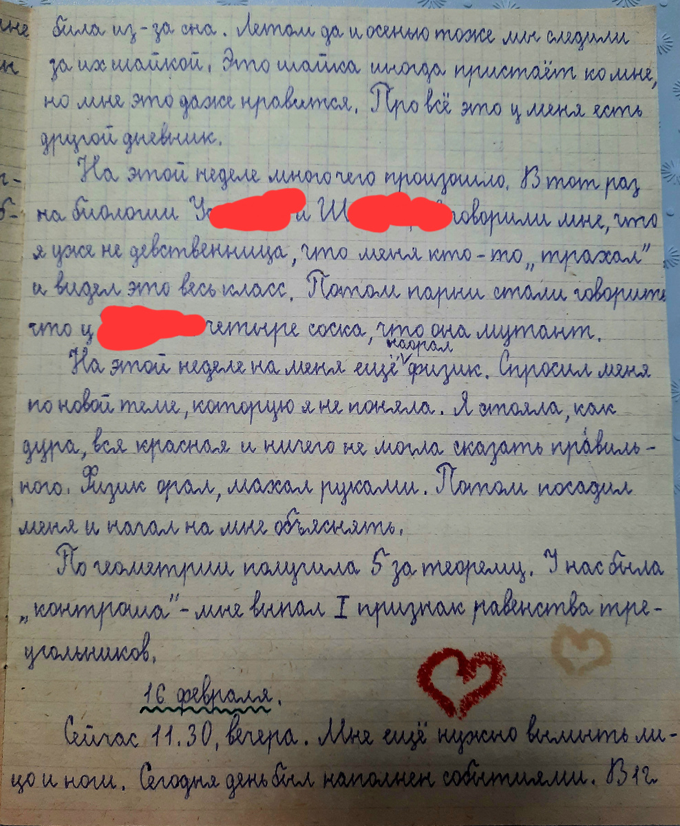 Я долго не писала - не было времени да и желания тоже. В школе задавали много уроков. Мы вчера учились, хотя была суббота. Сегодня воскресенье. Я буду делать уборку и мыться. Пойду к Вере, чтобы проверить домашку. У нас все парни в классе сексуальноозабоченные: задирают девкам юбки. А во вторник на уроке французского языка Пермяков сказал мне:" Дай за титьку подержаться". Пермяков самый длинный в классе. У него, как и у Уткина, на руке бородавка, ногти все в каком-то "грибке". Голубцову мы всё ещё не отомстили, но обязательно это сделаем. На этой неделе Голубец сломал мне ручку, а Вере помял контурную карту. Сейчас по ОРТ идёт телесериал "Девушка по имени Судьба". Я смотрю. Ладно. Пока писать кончаю. Я опять долго не писала - не было времени. Но всё равно я обо всём расскажу. Дело в том, что нас в классе не уважают. Особенно меня. Меня ненавидит Демидов и Бородулин. Я их тоже ненавижу. Больше я ненавижу Бородулина. Он пришёл к нам в этом году и уже командует. Рожа у него стр