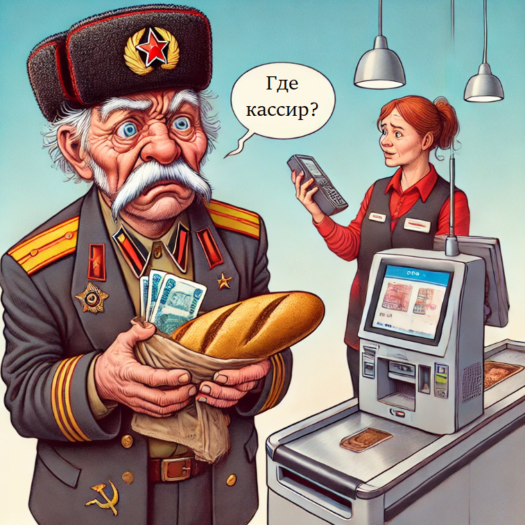 Первая карикатура переносит нас в супермаркет, где пожилой человек в военной форме времён СССР стоит перед кассой самообслуживания, держа буханку хлеба и старые советские рубли. Его растерянный взгляд и вопрос "Где кассир?" отражают столкновение прошлого с современными технологиями. Этот образ вызывает улыбку, ведь многие из нас сталкивались с подобными трудностями при переходе на новые технологии, будь то кассы самообслуживания или банковские терминалы. 2. "Вы меня всё ещё видите?"