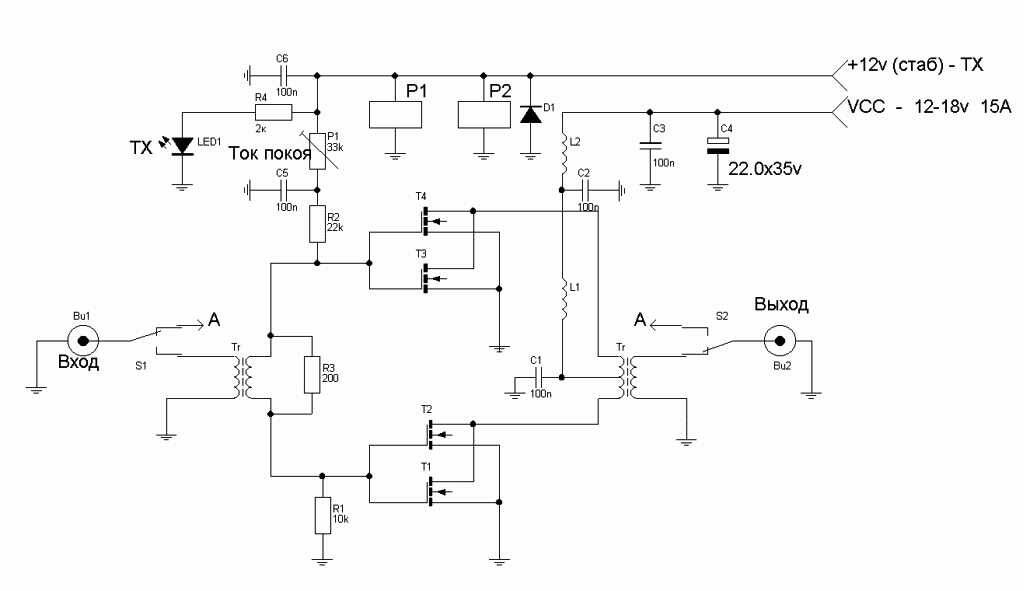Питать планирую нестабилизированным источником на основе трансформатора от бесперебойника, последний после выпрямителя и фильтра выдает порядка 28В в холостую и около 18-19В под нагрузкой в 15-20А. Накидаю побольше емкостей в фильтр и на первое время (когда оно начнется пока не ясно) пойдет. Да и вообще, не вижу смысла увеличивать мощность больше 100Вт. Ибо постоянно в эфире слышу как "киловатники" не могут принять корреспондента с 100-150Вт передатчиком. Получается что их, киловатников, слышат там, откуда своими ста-ваттами до них докричаться не могут. Какой в таком "спорте" смысл? А самое интересное то, что они все сидят и часами греют небо всякими "рогатыми" или батареями ГУ50, треща с корешами из соседнего села! Так-что пока максимум 150Вт, хорошая антенна и чувствительный приёмник! Тем более, что для третьей категории, на которую я нацелен, разрешено максимум 10Вт!!!