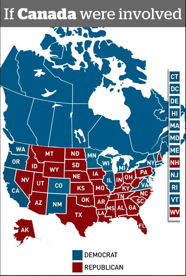 Канада стала бы самым большим штатом США по населению (впрочем с 40,1 млн. она бы несильно опережала Калифорнию – 39,4 млн.) и, разумеется, по площади (кроме того, она стала бы самой большой административной единицей в мире, обогнав Якутию). Она получила бы больше всех мест в Палате представителей (где-то 54), а канадская коллегия выборщиков состояла бы, таким образом, из 56 человек. Учитывая электоральные предпочтения канадцев, это бы значило, что республиканец не будет избран на пост президента… примерно никогда: