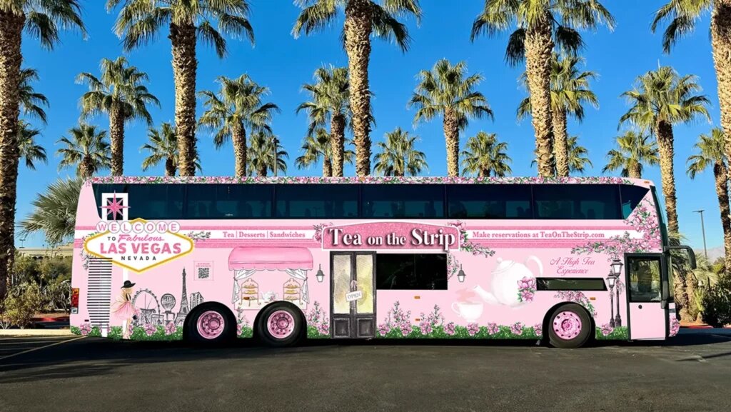 Всякий раз, когда мне на глаза попадается новость о чайных автобусах — ну то есть о таких автобусах, которые катаются мимо городских и загородных достопримечательностей и на борту которых как-либо по-особенному сервируется чая — я от таких новостей пытаюсь отмахнуться. Ну потому что все с этими автобусами давно понятно, ничего особенного в них нет, пары упоминаний в стиле «а еще с чем вот так бывает» для этой темы вполне достаточно. Однако всегда находится причина, по которой я решаю об очередном чайном автобусе хотя бы пару слов сказать. На сей раз такой причиной стала исключительная уместность. Ну потому что розовый снаружи и изнутри автобус с этажерками и стаканчиками с крышкой — как в Атланте, Филадельфии и некоторых других американских городах — катается теперь по Лас-Вегасу. Причем катается по Стрипу, разок отъезжая в сторонку — ну то есть по самым знаковым местам этого города. Все это дело так и называется — Tea on the Strip. И надо признать, конечно, что этот розовый чайный авт