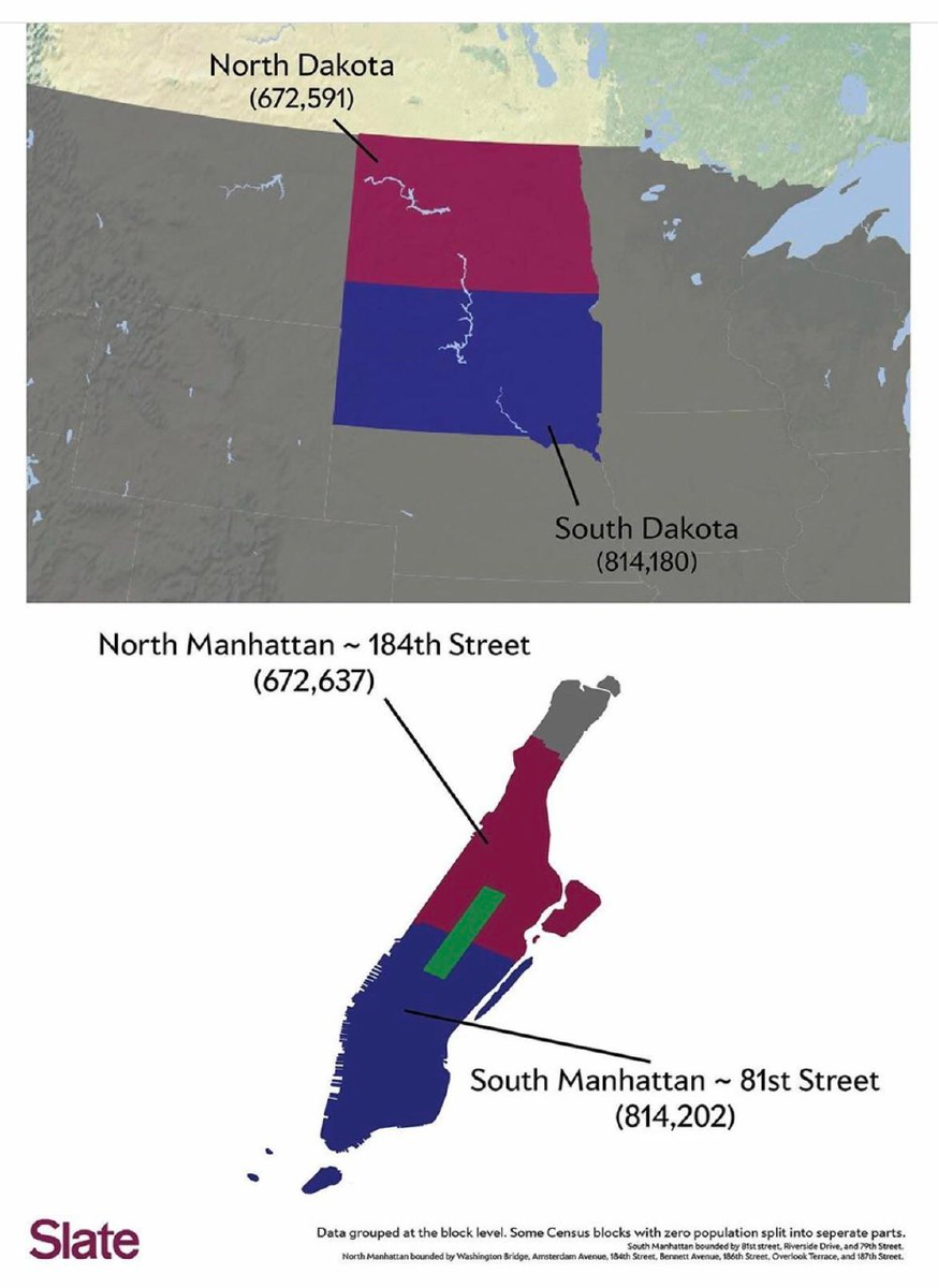 Внимательный читатель, конечно же, разглядит на этой любопытной карте, сопоставляющей население обеих Дакот и Манхэттена, эксклав Миннесоты на западном берегу Лесного озера: Это Северо-Западный Угол (Northwest Angle), самая северная точка континентальных (в смысле contiguous) Соединенных Штатов. Строго говоря, специалисты характеризуют его как пенеэксклав, или «практический эксклав», удобный (наземный) доступ в который возможен только через территорию другого государства. Появился он в результате… не то, что ошибки – скорее, оперирования недостоверными данными. Парижский мир 1783 года, устанавливал границу между США и британскими владениями к западу от озера Верхнего следующим образом: … through Lake Superior northward of the Isles Royal and Phelipeaux to the Long Lake; thence through the middle of said Long Lake and the water communication between it and the Lake of the Woods, to the said Lake of the Woods; thence through the said lake to the most north-westernmost point thereof, and