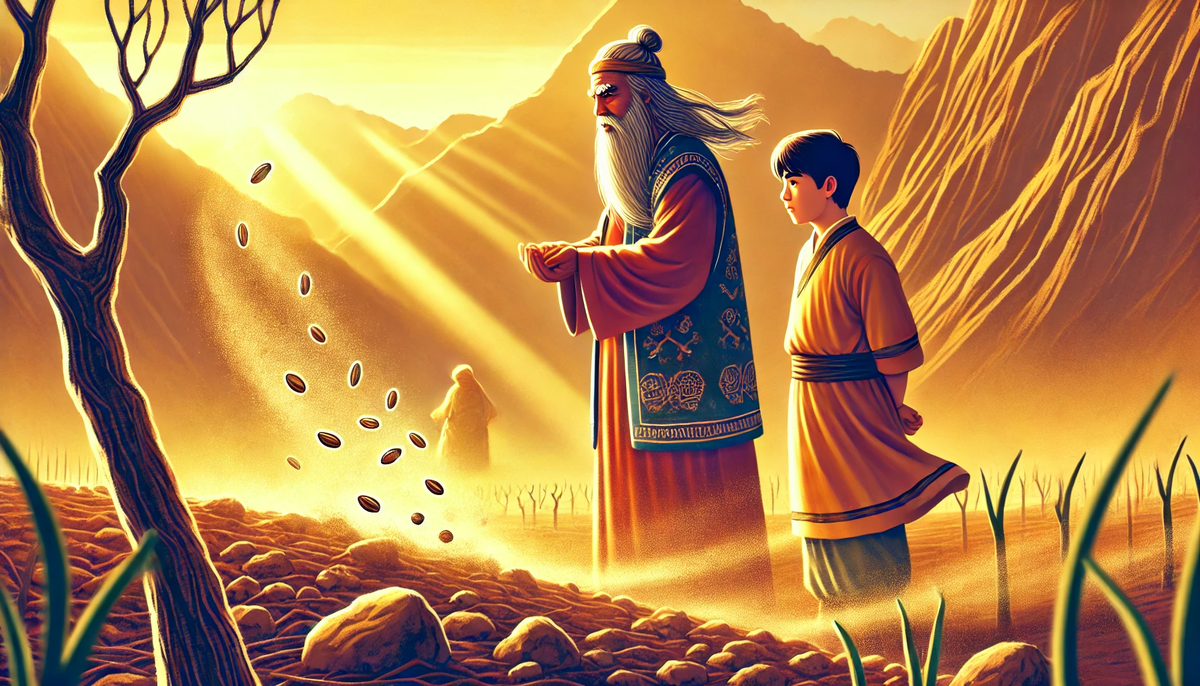 Тогда мудрец взял юношу за руку и вывел в поле. Там стоял старый крестьянин, который держал в руках мешок с семенами.