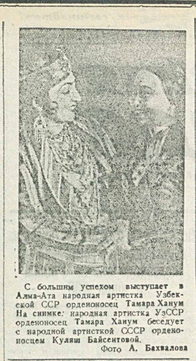 Приезд в Казахстан даровитой узбекской актрисы сближает еще теснее искусство братских республик Советского Союза.