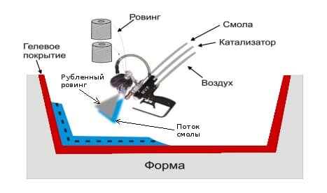 Метод напыления в производстве стеклопластиковых изделий реализуется с помощью специальных машин — установок для напыления смолы с рубленным стеклоровингом.