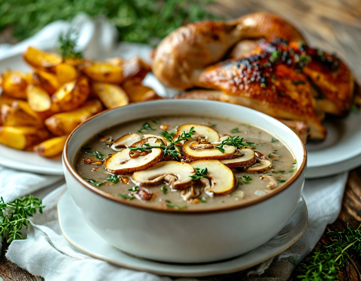 Идеальный дуэт для обеда: насыщенный грибной суп и сочные куриные бедра.
