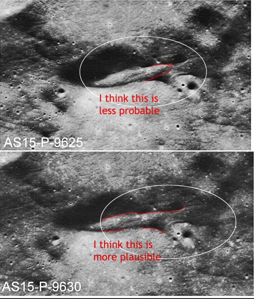 Далее, миссии продолжаются. Аполлон-15 делает странную фотографию на которой можно разглядеть некий объект, расположившийся в овраге.