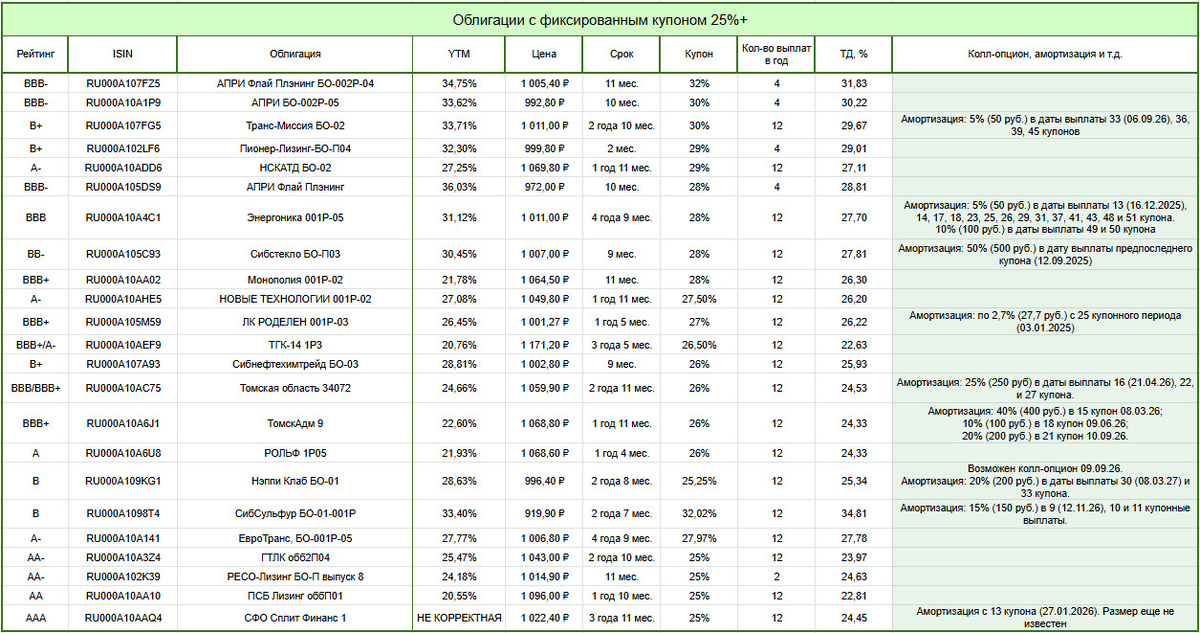 Мой прогноз, что 14.02.2025 Центральный банк России оставит ключевую ставку. В связи с чем в настоящее время рассматриваю облигации флоатеры и с постоянным купоном у эмитентов с рейтингом ВВВ+ и выше. Не более 2% на выпуск одного эмитента. На одном из форумов по инвестициям-увидел у автора Frank.K подборку облигации с купоном более 24% - сам пост Решил прикупить: 📌Томская область 34072 $RU000A10AC75 Рейтинг: BBB+/BBB • Купон: ежемесячный, постоянный, 26.5% • Срок: 3 года • Амортизация: ➕ •Оферта: ➖ •Квал: ➖ 📌ТГК-14 1Р5 RU000A10AS02 Рейтинг: BBB+/BBB+/A- (ЭКСПЕРТ/АКРА/НКР) Дата погашения: 09.01.2029 купон: постоянный, выплат в год 12, ставка 24.75%, амортизация: Нет, оферта: Нет 📌ГТЛК 2Р-04 $RU000A10A3Z4 Рейтинг: АА- (АКРА) Доходность к погашению: 25,44% (купоны 25%,ежемесячные) Амортизация: нет Дата погашения: 25.10.2029 (оферта 05.11.2027) 📌Россети Московский регион 001P-05 RU000A107DP1 Кредитный рейтинг AA+ Ставка купона 22.16%-плавающий купон Дата погашения 28-11-2026 📌