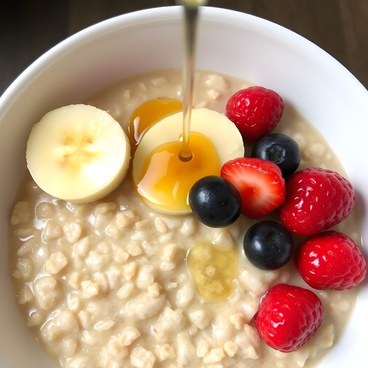 - Когда овсянка будет готова, добавьте нарезанные фрукты и мед. Перемешайте и подавайте горячей.