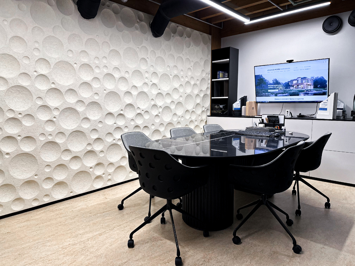 Современный офис — это отражение ценностей и стиля компании. Офис Good Wood в Подмосковье — пример гармоничного сочетания дерева и стекла, отражающего стремление к естественной элегантности. Дизайнер Мария Лазич поддержала эту концепцию, создав умиротворяющее пространство в переговорной «Луна». Главным элементом стала акцентная стена, имитирующая лунную поверхность. Светло-серо-бежевая штукатурка Pethra Matt от Luxus Paint на гипсовых панелях создает монолитное панно без швов. Интерьер отличается природными мотивами, минимализмом и спокойной цветовой гаммой, что создает атмосферу сдержанной роскоши и располагает к продуктивной работе. Этот проект демонстрирует, как с помощью дизайна можно создать вдохновляющую рабочую среду. Найти свою идеальную фактуру для проектов вы можете здесь: https://kraska-store.ru/catalog/dekorativnye-pokrytiya/luxus-paint/