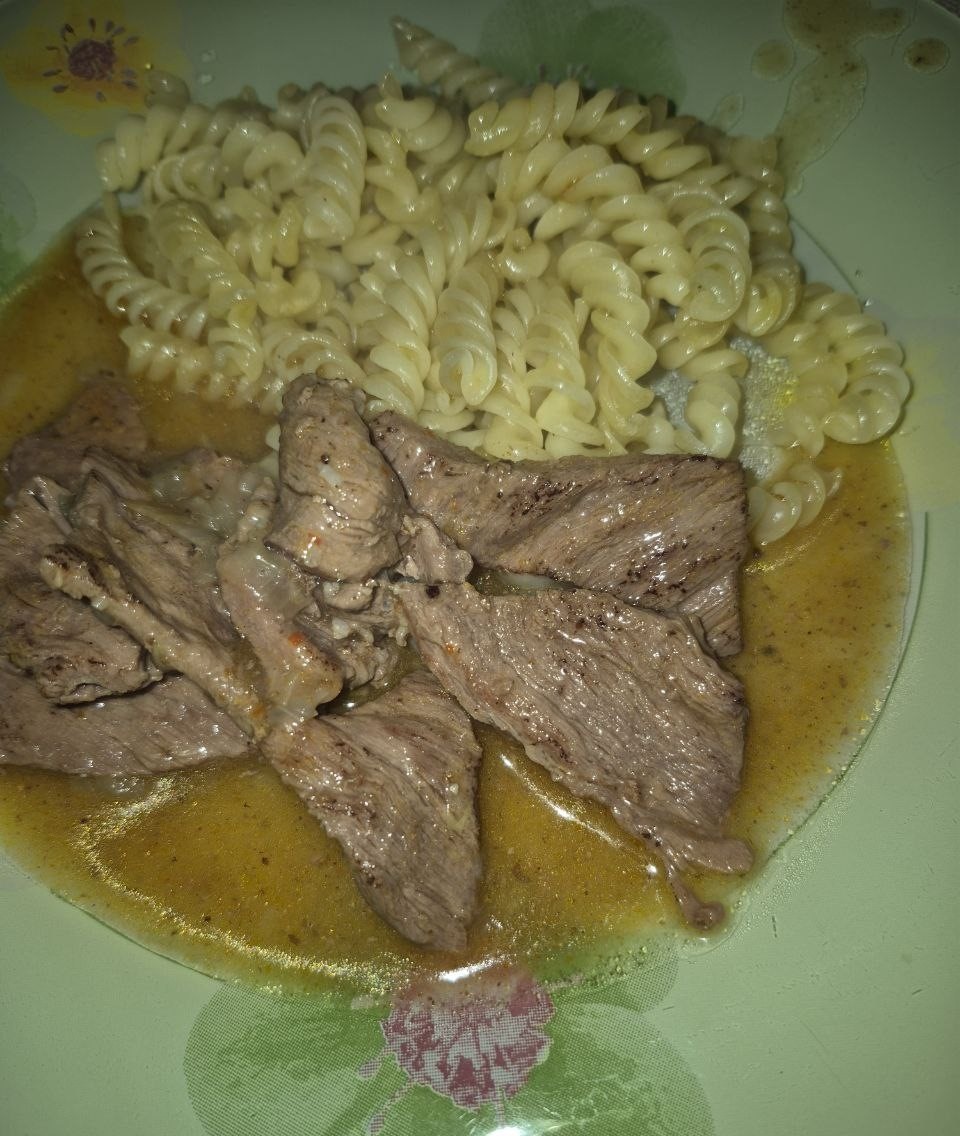 Говядину (300 грамм) нарезаем средними слайсами и отправляем на разогретую с маслом сковороду.