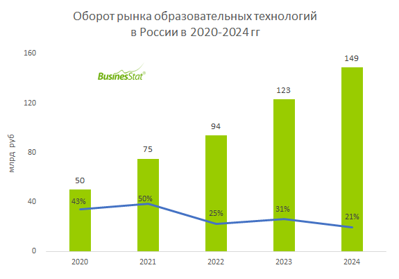 В 2024 г оборот рынка образовательных технологий в России вырос на 21% и составил 149 млрд руб.