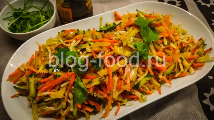 Всем привет. Сегодня у нас в гостях азиатский гость — овощной салат, основную роль в котором играет дайкон. В принципе, можно взять редьку, но дайкон имеет более мягкий вкус, так что лучше его ). Продуктовый набор: Кинзу рубим помельче, все остальное режем соломкой. Давим чеснок, добавляем кунжутное масло, соевый соус, чили соус, лимонный сок, перемешиваем. Складываем все ингредиенты в миску... ...заправляем, и подаём. Приятного аппетита!