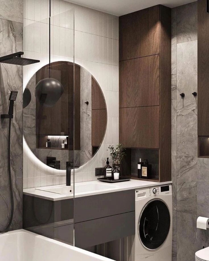 - Точечные светильники, бра, над умывальником и зоной душа для создания акцентов и удобства использования.
