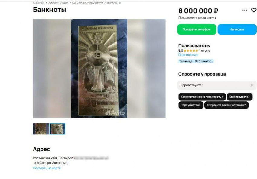 Тренд на продажу купюр за баснословные деньги не отпускает Таганрог. Недавно появилось еще одно объявление, в городе выставлена на продажу сувенирная купюра за 8млн рублей.