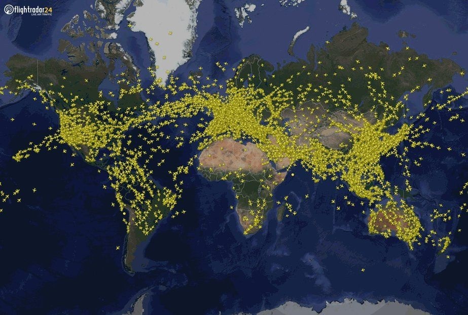 На борту каждого самолёта стоят передатчики ADS-B transponder(Automatic Dependent Surveillance – Broadcast, что в переводе звучит как автоматическое зависимое наблюдение в режиме радиовещания), посылающие сигналы на наземные и спутниковые ADS-B приемники. Жёлтые самолётики на экране компьютера говорят о работе наземных ADS-B приёмников, а синие – спутниковых (обычно работающих над огромными океанскими просторами). Клик мышкой на жёлтом или синем самолётике превращает его в красный и обозначает номер рейса и показывает параметры полёта.