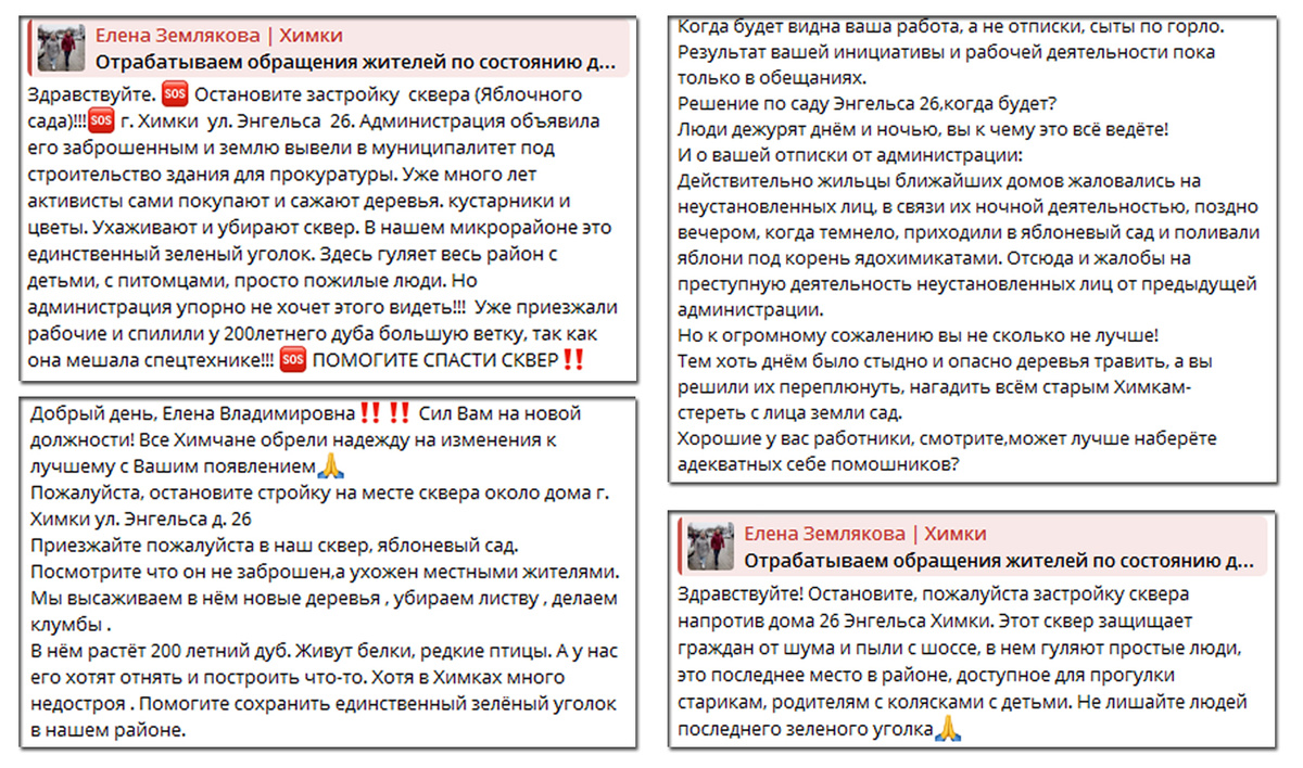 В телеграм-канале врио главы Химок Елены Земляковой (@zemlyakova_khimki), в комментариях десятки сообщений с просьбой остановить застройку застройку сквера у дома Энгельса 26. Участок с кадастровым номером 50:10:0000000:13843 — относится к теплосетевому комплексу «Старые Химки II» и предназначен для теплоснабжения. Жители близлежащих домов сами сажали деревья и кустарники, чтобы озеленить эту территорию. Обратите внимание, что у всех деревьев есть специальные ограждения, что говорит о заботе и внимании к саженцам. На многих деревьях приделаны специальные кормушки для птиц и белок, которые любят посещать этот сквер. У каждой кормушки есть памятка по кормлению, с описанием, что любят зверьки и птицы. Достропримечательностью этого сквера является Дуб черешчатый или обыкновенный - памятник природы местного значения. Возраст 163 года. Обратите внимание, как любители этого сквера о нем заботятся, что редко встречается в наши дни! Понятно, что сейчас зима, поэтому на фото не видно всей красот