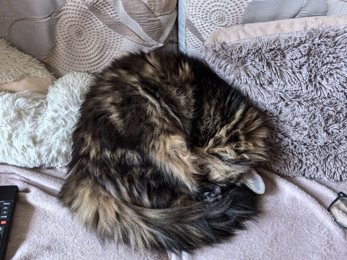 Посмотрел сериал с людишками и все спать собрались. А я ещё и халат намесил, аж 2 раза. И потом несколько раз выходил на балкон, но долго не смог сидеть. Возвращался и возмущался на холод. А спал, притулив Ж к хозяйке. Ну чтоб теплее было.