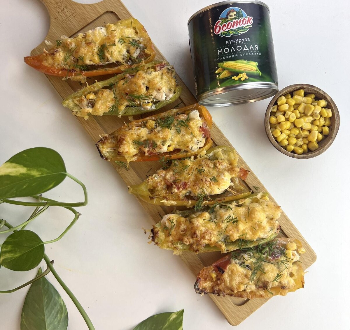 - Нарезаем перцы пополам и очищаем от семечек. Филе нарезаем небольшими кусочками. Добавляем соль, специи, нарезанный кубиками помидор, сметану, зелень, кукурузу и перемешиваем.