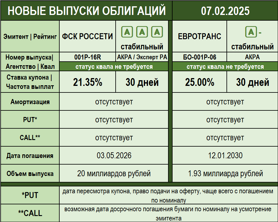 🥳 Ураааа, наконец-то пришла пятница, привет! Финишная прямая к заслуженному (надеюсь) отдыху, но пока небольшой пост о сегодняшних новинках. ✅ Две бумаги вы сможете найти в биржевых стаканах после обеда: 〰️〰️〰️〰️〰️〰️〰️〰️〰️〰️ 🟢 ФСК РОССЕТИ 001Р-16R 📊 🅰️🅰️🅰️ 🔹 ISIN: $RU000A10ATT8 ▪️Купон фиксированный: 21.35% ▪️Без оферт и досрочного погашения ▪️ Погашение через 1.25 года ▪️ Рейтинговый отчет: ➖ https://raexpert.ru/releases/2024/apr12h ➖https://www.acra-ratings.ru/press-releases/5157/ Очередной выпуск от компании наивысшего рейтинга с символической премией к текущей ключевой и весьма коротким сроком торгов. Последнее время набежало их в достатке, а сколько еще впереди... Наверное, полезно будет собрать имеющиеся рядом. Итак, что мы имеем в этом году? - $RU000A10ANZ8 МАГНИТ 005Р-01, купон 21,5%, погашение 19.04.2026 - $RU000A10AP21 ИКС 5 ФИНАНС 003Р-08, купон 21,5%, пут-оферта 16.02.2026 - $RU000A10ASB8 РОССЕТИ 001Р-15R, купон 21,5%, погашение 25.07.2026 - $RU000A10ASS2 РОСТЕ