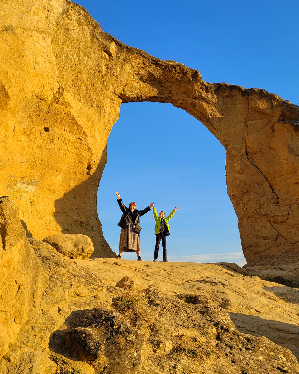 Всегда поражаюсь местным жителям, которые говорят — да нечего у нас смотреть. Но в Кисловодске было ещё круче. Ехать на гору Кольцо нас отговаривал дядька, который продаёт экскурсии... в том числе на гору Кольцо. Это прям высший уровень какой-то))) Но мы, конечно, поверили не дядьке, а Михаилу Юрьевичу Лермонтову. Он точно плохого не посоветует. ...от Кисловодска, в ущелье, где протекает Подкумок, есть скала, называемая Кольцом; это — ворота, образованные природой; они поднимаются на высоком холме, и заходящее солнце сквозь них бросает на мир свой последний, пламенный взгляд. Многочисленная кавалькада отправилась туда посмотреть на закат солнца сквозь каменное окошко…» ...времени». И точно подмечено у классика про закат. Именно в это время надо ехать на гору, чтобы получить самые лучшие виды и фотографии. Ну красота же получилась! Внутри самой скалы мы тоже постояли — на удачу. Это поверье пришло из старинных легенд. Считалось, что воин, проскакавший сквозь Кольцо в полном вооружении,