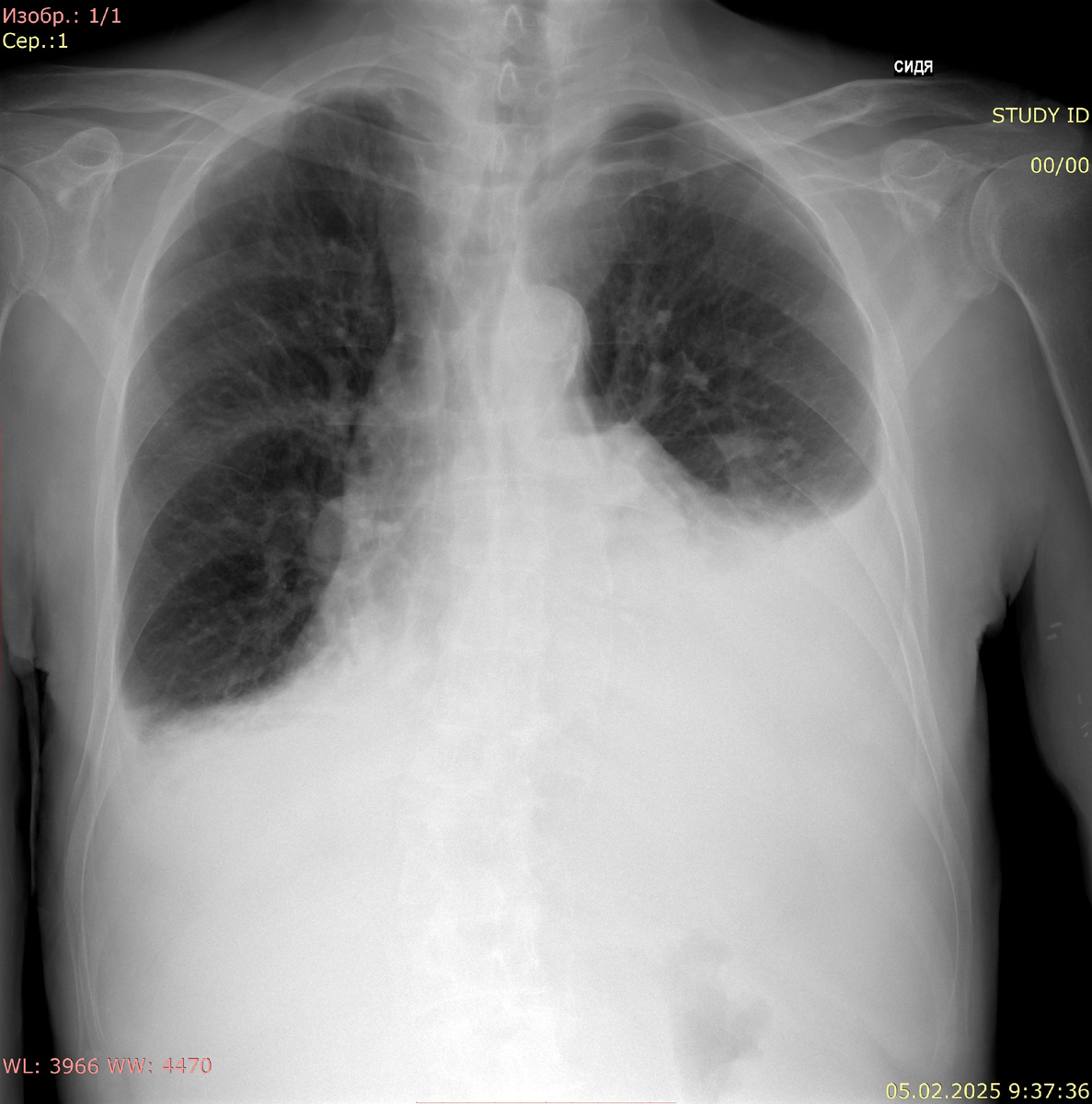 Тень средостения не смещена, не расширена. Корни структурны, не расширены. В легочных полях тени плеврального выпота (слева до 4-5 ребра, справа до 6-7 ребра). Свободного газа нет. Контуры диафрагмы четкие, ровные. Костно-деструктивных изменений не выявлено Заключение: Двусторонний плевральный выпот Рентгенография органов грудной клетки в прямой проекции: