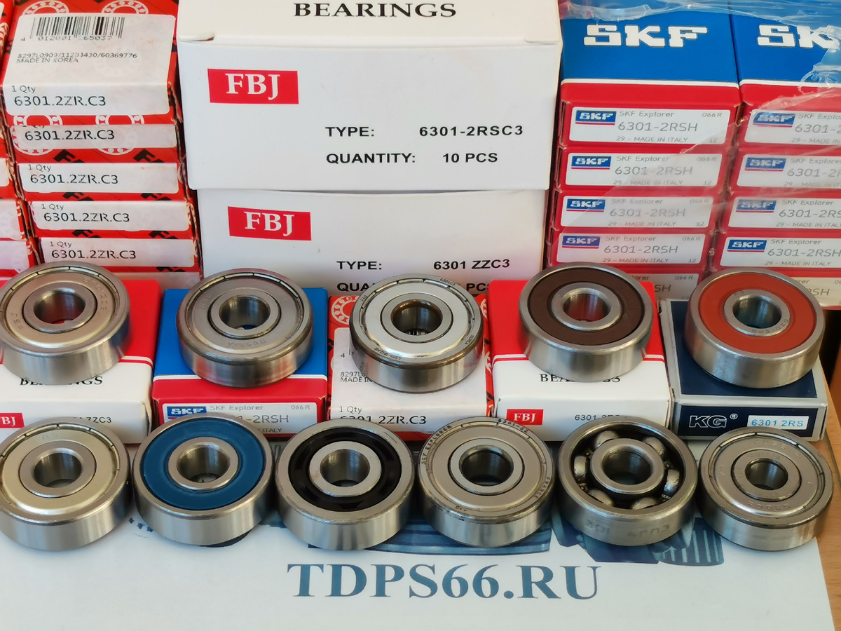 301- шариковый радиальный подшипник имеет несколько разновидностей, 50301 — с проточкой по наружной обойме под стопорное кольцо, N 60301 — закрытый металлическими шайбами с одной стороны, Z 80301 — закрытый металлическими шайбами с двух сторон, ZZ 180301 - закрытый с обеих сторон резиновыми заглушками 2RS 6301С3 с тепловым зазором для применения в узлах с высокой температурой, которая высока настолько, что подшипник расширяется и оказывает давление на вал (76-301). Импортное обозначение 6301. Сепаратор из: Б- бронзы, Е- текстолита, Ю - нержавеющей стали. Дополнительный тепловой зазор проставляется самой первой цифрой 0 справа от класса точности подшипника например 75 — 301— группа теплового зазора — 7, класс точности — 5 и может быть равен 5, 6, 7, но в основном выпускаются и пользуются спросом подшипники с увеличенным зазором 7 76-180301или 70-180301. Характеристики подшипников: Внутренний диаметр – 12 мм; Наружный диаметр – 37 мм; Ширина — 12 мм; Масса – 0,06 кг; Количество шариков —