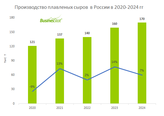 За 2020-2024 гг выпуск плавленых сыров в России увеличился на 40%: со 121 до 170 тыс т.
