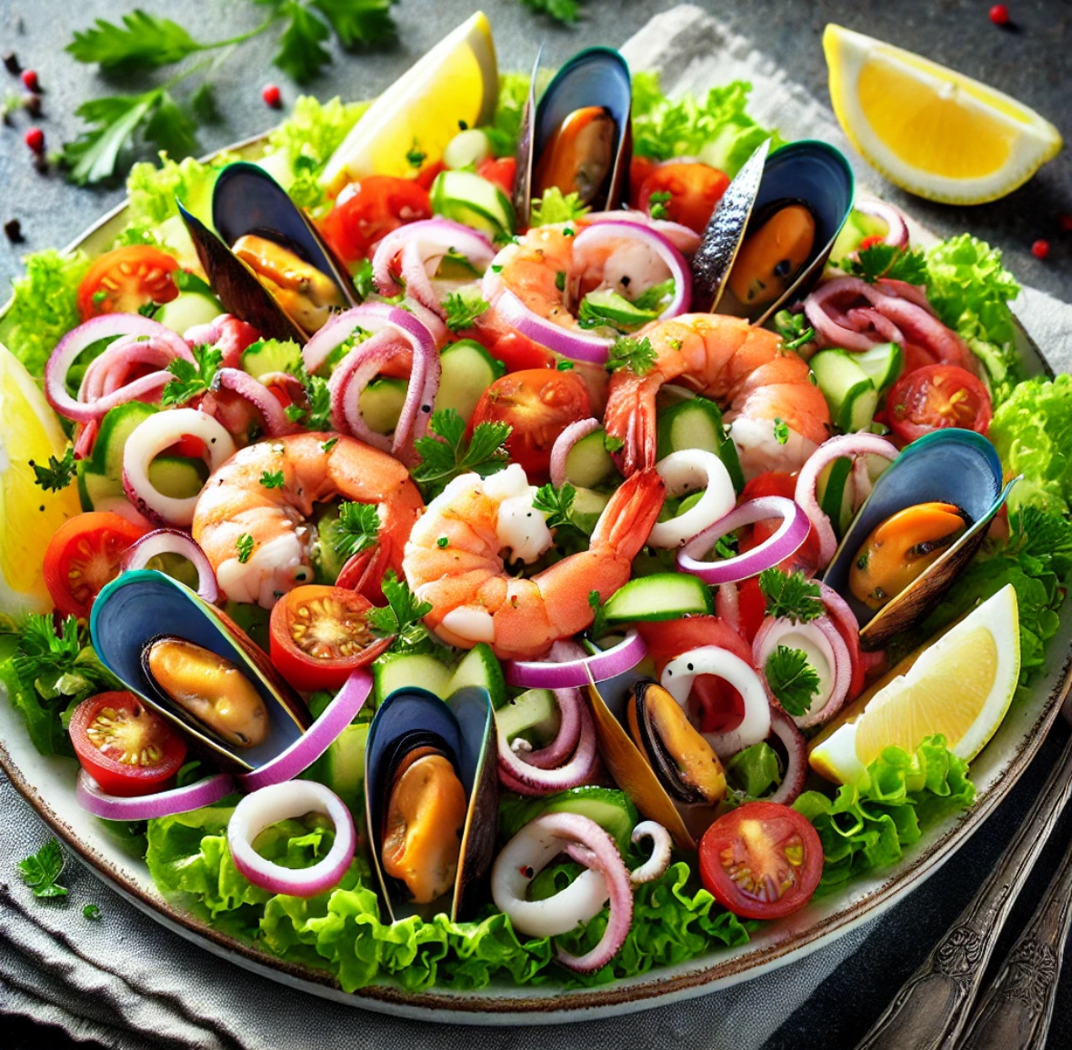 Салат "Морской коктейль" — это изысканное блюдо, которое сочетает в себе нежность морепродуктов и свежесть овощей. Этот салат не только вкусный, но и полезный благодаря богатому содержанию белков, омега-3 жирных кислот, витаминов и минералов, которыми богаты морепродукты. Он идеально подойдёт для лёгкого ужина или станет изюминкой вашего праздничного стола. Приготовить его несложно, а результат порадует всех ценителей морских деликатесов. Морепродукты, используемые в этом салате, не только придают ему изысканный вкус, но и являются источником многих полезных веществ: Этот салат — не просто вкусное блюдо, но и источник множества полезных веществ, которые необходимы для поддержания здоровья. Лёгкий, но питательный, он отлично подходит для тех, кто следит за своим питанием и хочет разнообразить свой рацион морепродуктами. Благодаря свежим овощам и морепродуктам, салат "Морской коктейль" получается лёгким и освежающим, что делает его идеальным вариантом как для повседневного меню, так и