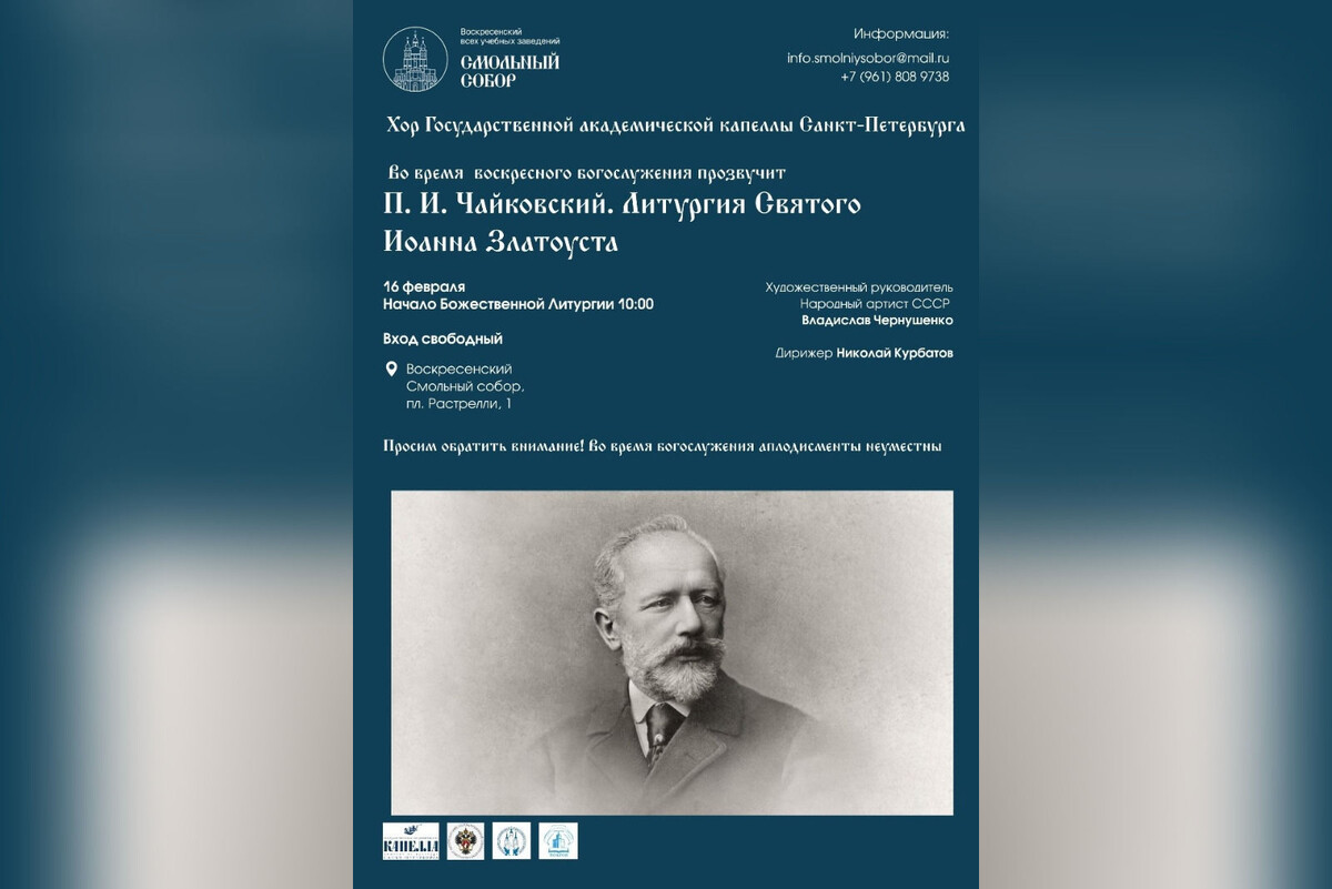 В следующее воскресенье, 16 февраля, во время богослужения в Воскресенском Смольном соборе прозвучит Литургия Святого Иоанна Златоуста П. И. Чайковского в исполнении хора Государственной академической капеллы Санкт-Петербурга. Событие приурочено к 190-летию освящения Смольного собора и наименования его Николаем I как Собора всех учебных заведений. В качестве художественного руководителя выступит народный артист СССР Владислав Чернушенко, а в роли дирижера – Николай Курбатов. Начало в 10:00 по адресу: площадь Растрелли, дом 1. Воскресенский Смольный собор. Напомним, ранее мы писали, что Валерий Гергиев и Мариинский театр представят «Немецкий реквием» Брамса в Петербурге и Москве. Подробнее читайте здесь.