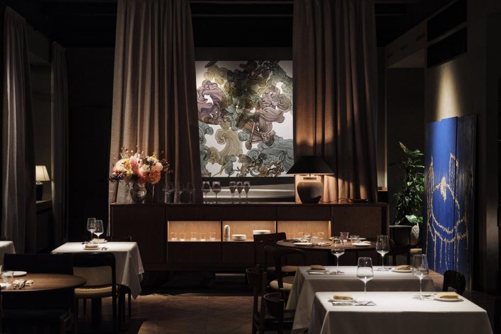 Интерьер в большей степени остался прежним, таким, каким был в ресторане Recolte: мебель премиальных брендов, продуманное освещение, отделка из дерева, камня и льна. Но есть и отличия: пространства между столиками стало значительно больше, появилась открытая кухня и новые картины.