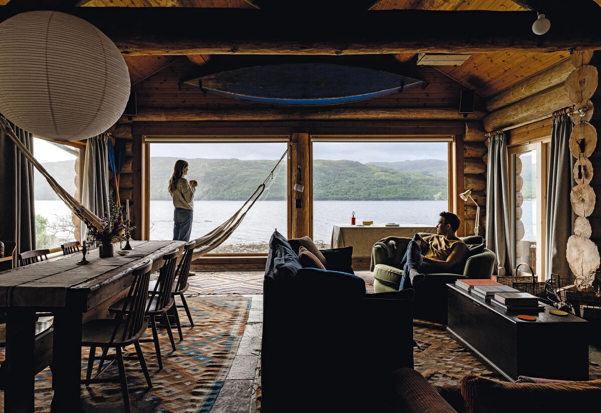 Когда пятнадцать лет назад Том и Конни начали встречаться, Конни привезла своего парня на западное побережье Шотландии, где они неделю прожили в уединённом коттедже. Как выяснилось позже, это было своего рода испытание для будущего мужа. Девушке нужно было получить ответ на вопрос: «Любит ли этот парень природу Шотландии так, как люблю ее я?». Оказалось, что любит, и даже очень. И вот через много лет, Том и Конни Бартон, успешные ресторатор и графический дизайнер, решили, что им нужен в Шотландии собственный дом, куда они смогут выбираться из Лондона. В 2021 году пара приобрела дом своей мечты на далеком полуострове, в четырёх часах езды к северу от Глазго. Дом сделан из кедрового дерева. В нем огромное панорамное окно, выходящее на озеро Лох-Санарт, и массивные балки из пихты Дугласа. Мебель и декор покупали на онлайн-аукционе The Saleroom. Мебель в доме в основном подержанная, с историей. Например, винтажный двухместной диван Heal, гамак от дизайнера Илзе Кроуфорд, шведский зеленый