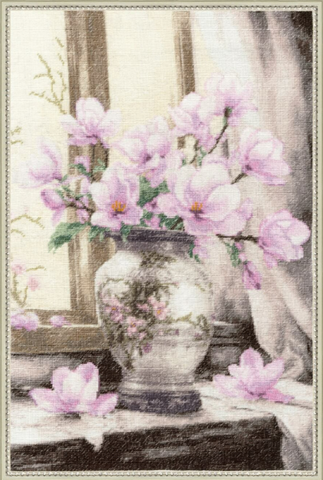 Сегодня у нас морозное утро, безоблачное небо изумительной голубизны. И яркое уже по-весеннему солнце. Душа радуется и поёт. И требует срочного пополнения запасов пряжи и вышивки. Просмотрела каталог новинок на сайте Золотого руна. Есть и привлекательные сюжеты. На переднем плане – на фоне деревянной оконной рамы на подоконнике стоит керамическая ваза с букетом магнолий. Объемистые бока сосуда покрыты росписью. Цветущая ветка, склонённая над водоёмом. Сквозь оконное стекло виднеется ветка куста или дерева, ещё без листьев. На подоконнике и частью на раме лежат цветы и лепестки, словно упавшие при формировке букета. Сама же композиция нежная, словно пронизанная светом. Совсем немного зелени и цветы. Прозрачный и восхитительно красивый сюжет. Цвета ниток светлые, словно на фоне рисунка сепией нарисована картина с букетом. Мулине Madeira 34 цвета, канва Zweigart 18 каунта белая. Ширина готовой работы 25,5 см, высота 39 см. Вышивается в 2 нити крестиком и полукрестом. Вышивка выполнена по
