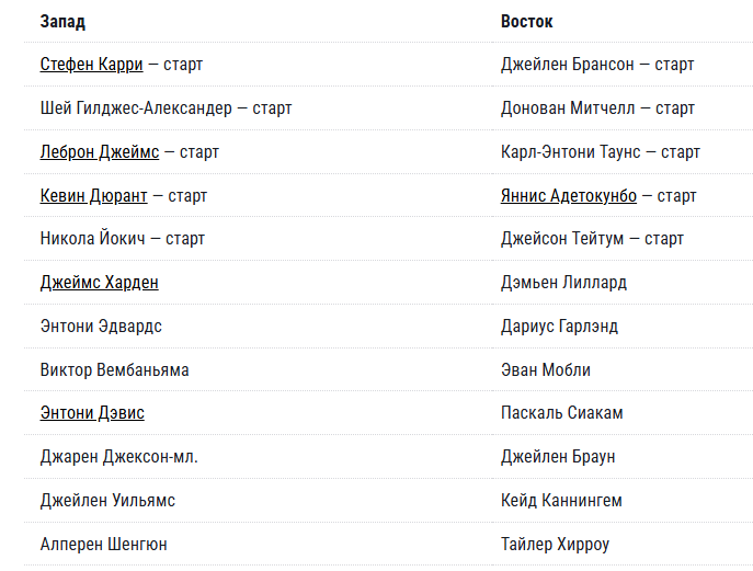 Определены окончательные составы команд на матч всех звезд. В этом году игроки зала славы а именно Шакил О'Нил, Кенни Смит и Чарльз Баркли набирали себе в команду игроков. 24 баскетболиста по 12 с каждой конференции были перетасованы и собраны в 3 команды. Четвертой командой станет команда-победитель матча восходящих звезд. Матч пройдет 14 февраля. Команда Шака Стефен Карри, Леброн Джеймс, Энтони Дэвис, Кевин Дюрант, Джейлен Браун, Джеймс Харден, , Дэмьен Лиллард, Джейсон Тейтум. Дэвис вновь сыграет со своим братишкой Леброном. А Карри с Дюрантом вспомнят былые времена золотого состава ГСВ. Как же Леблон без Карри на матче всех звезд? Команда Чарльза Никола Йокич, Яннис Адетокунбо,Виктор Вембаньяма Шей Гилджес-Александер, Донован Митчелл, Алперен Шенгюн, Паскаль Сиакам, Карл-Энтони Таунс. Глядя на этот список и трех высоченных башен, становится страшно за две оставшихся команды. Что эти зверюги будут творить под кольцом страшно представить. Команда Кенни Тайлер Хирроу, Дариус Гарлан