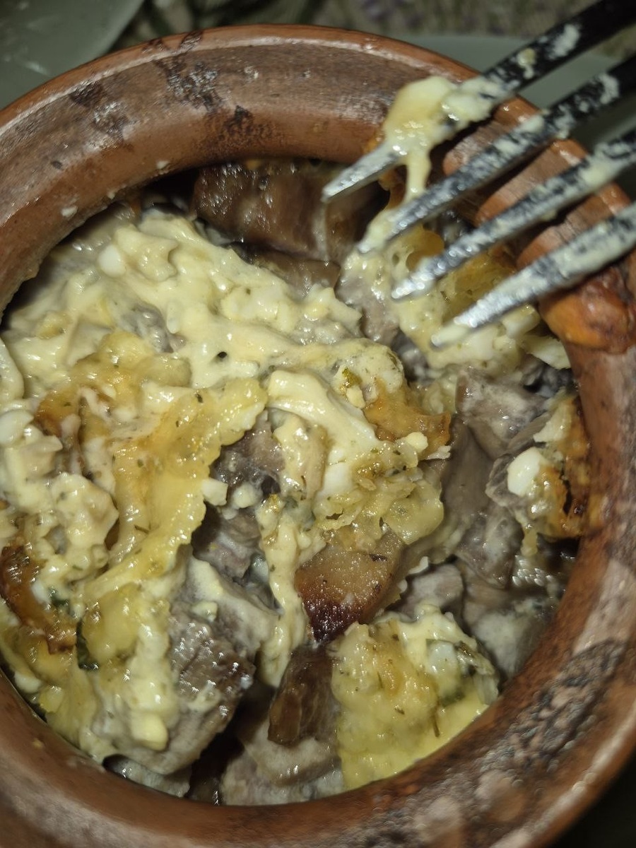 Грибы режем крупным кубиком, обжариваем, солим по вкусу добавляем сметану/жирные сливки, при необходимости еще присаливаем. Томим 5 минут до загустения соуса. Сыр натираем на крупной терке. На дно горшочка укладываем картофель, чуть разминаем его вилкой, при необходимости немного присаливаем, кладем немножко сливочного масла.