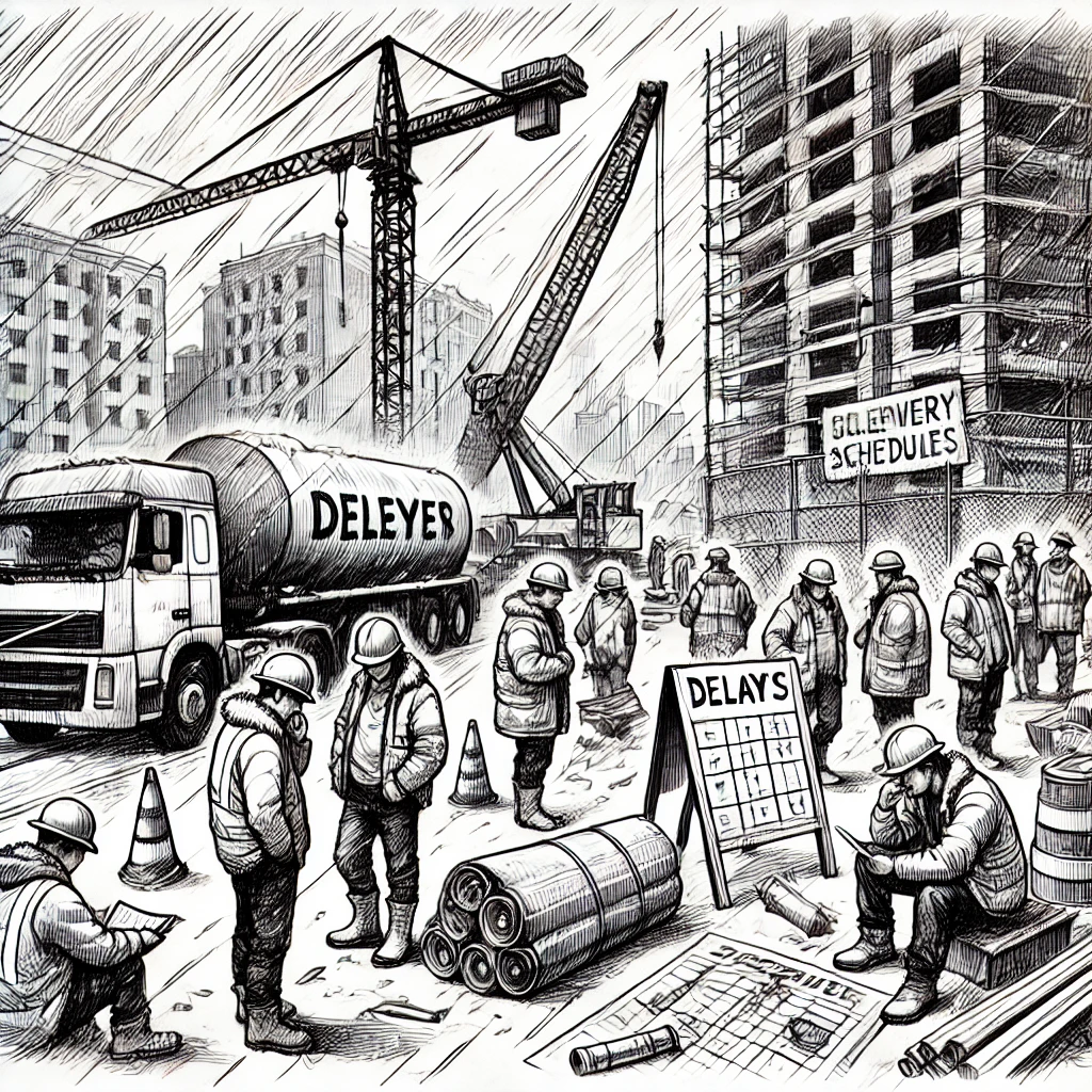 Строительные проекты — это сложные системы, где каждый элемент должен работать слаженно. Мы детально планируем, создаем сетевые модели, предусматриваем буферы, анализируем риски, разрабатываем резервные сценарии. Но даже самое тщательное планирование не гарантирует защиты от форс-мажоров. Разберем наиболее частые события, способные серьезно повлиять на ход стройки. Вероятность: Высокая. Даже с учетом сезонности и прогнозов погода остается одной из главных причин сбоев. Ливни, метели, ураганы, резкие температурные перепады могут замедлить или полностью остановить стройку. Пример: после сильных дождей грунтовые основания теряют устойчивость, что делает невозможной доставку тяжелой техники и материалов. Как решают проблему: разработка адаптивных календарных планов, резервирование «сухих» работ, которые можно выполнять независимо от погодных условий. Вероятность: Высокая. Крупные стройки зависят от сложной логистики. Любая задержка — на таможне, у производителя, проблемы с транспортом — мо