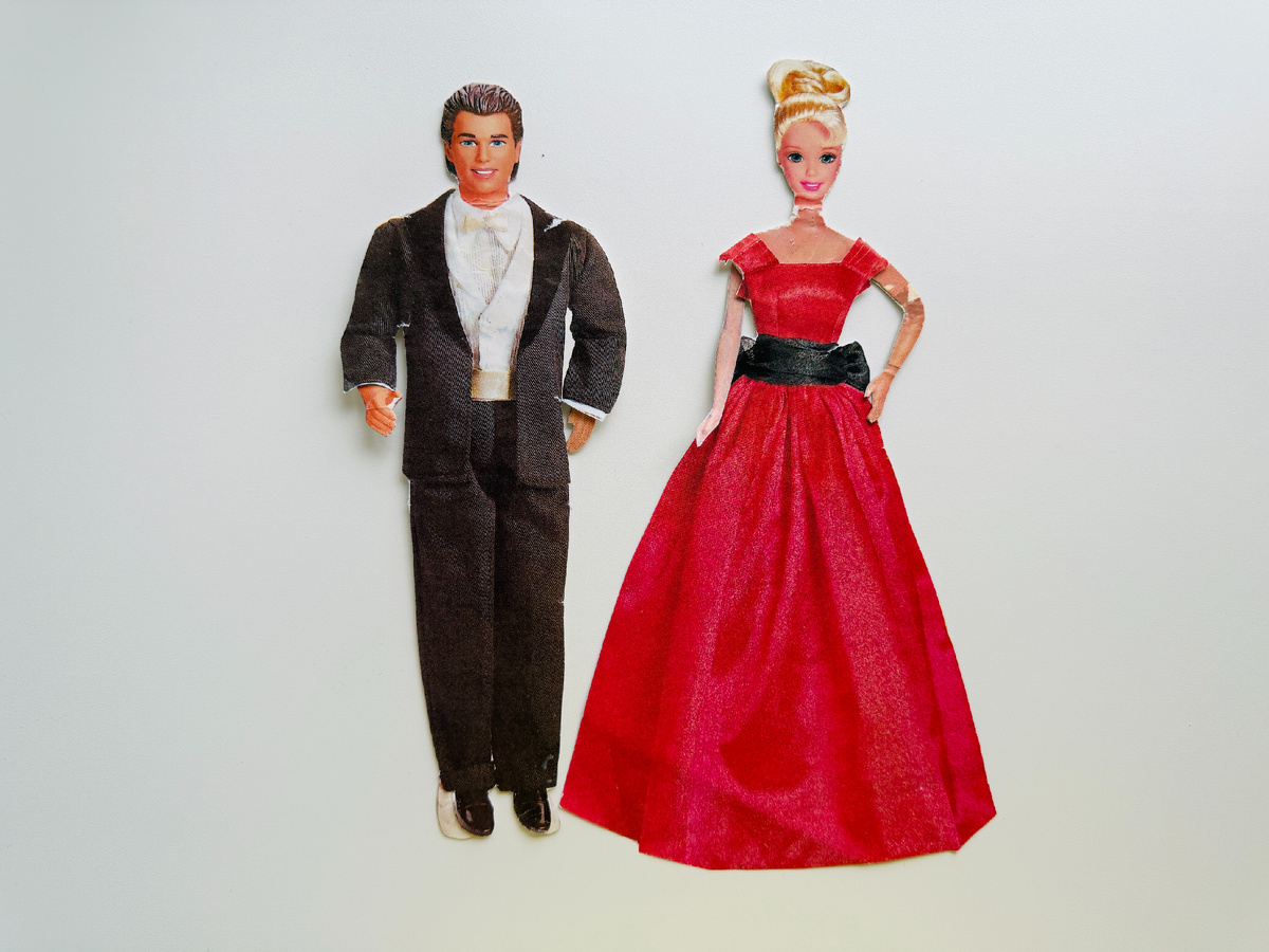 Благодаря бумажным куколкам появилась Барби -- "мама" Барби Рут Хэндлер увидела, что её доченьке интереснее играть со взрослыми бумажными куколками, чем с малышами-настоящими и сделала взрослую "настоящую" куклу. А потом уже наступила очередь Барби перейти на бумагу: У меня всего лишь семь наборов с Барби, один я как-то показывала, ещё есть два магнитных, остальные более-менее современные, невырезанные пока, два по мотивам недавно вышедшего фильма, и вот этот, сегодняшний: Эти куколки приехали ко мне из Америки, я покупала других, а этих положили, что называется "до кучи". Состояние у них сами видите, не "mint condition", но мне они всё равно нравятся: А обратили внимание, что на первых двух фото Барби кажется выше Кена из-за длины платья? А в платьях с открытыми ножками сразу как-то меньше становится: Нарядов маловато -- у Кена три костюма, у Барби четыре платья, но я не жалуюсь. Тем более может это просто у меня не все. А ещё такие куколки меня вдохновляют учиться чему-то новому --