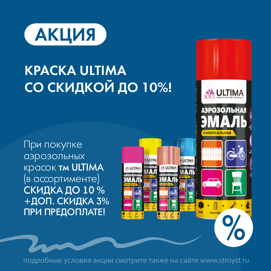 Рады объявить об акции, действующей ДО КОНЦА ФЕВРАЛЯ. При покупке аэрозольной краски Ultima скидки на объем: От 2000 шт. — скидка 10% От 1000 шт. — скидка 7% От 500 шт. — скидка 4% От 100 шт. — скидка 2%