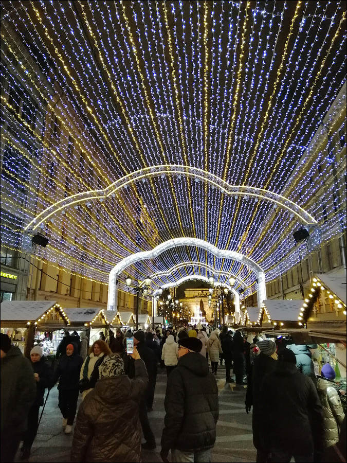 Напротив, в Екатерининском сквере, сияли Вифлеемские звёзды в ветвях деревьев, Невский переливался праздничными огнями, и не верилось, что ещё утром мы проснулись в вагоне поезда. День был таким длинным — и всё продолжался, и до завершения сегодняшнего путешествия было ещё далеко!