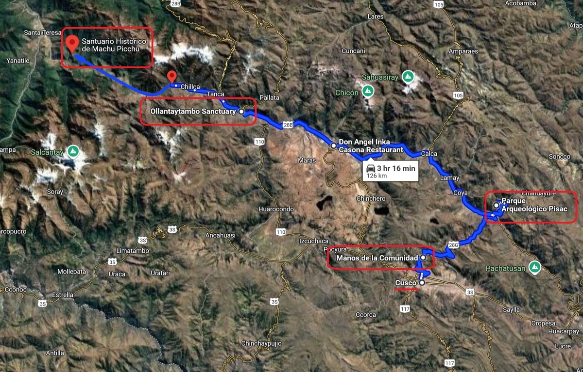 Теперь немного о планах на предстоящие несколько дней. Главная цель — пройтись по тропам инков и дойти до Мачу-Пикчу, но перед этим денёк потратить на акклиматизацию в окрестностях Куско, посетив пару старых городов инков: Писак и Ольянтайтамбо. Это на автобусе, а затем уже ножками топать до Мачу-Пикчу. Примерно вот так: