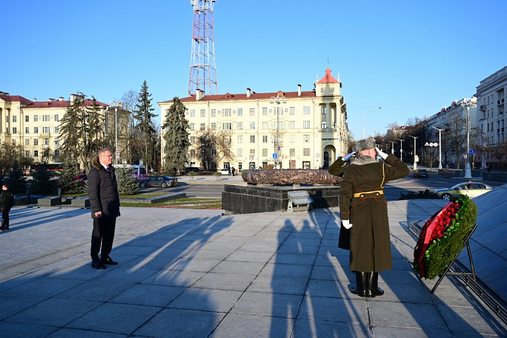 Радий Хабиров отдал дань памяти героям в ходе своего визита в Беларусь. Монумент Победы в Минске установлен в 1954 году. Памятник высотой около 40 метров облицован серым гранитом, грани постамента оформлены бронзовыми горельефами. Монумент венчает изображение ордена Победы. В 1961 году у основания обелиска зажгли Вечный огонь. Под землей монумент окружен кольцевой галереей, переходящей в круглый мемориальный зал в честь героев Великой Отечественной. В центре расположен венок из художественного стекла с подсветкой — символ Вечного огня. Фото с сайта главы РБ.