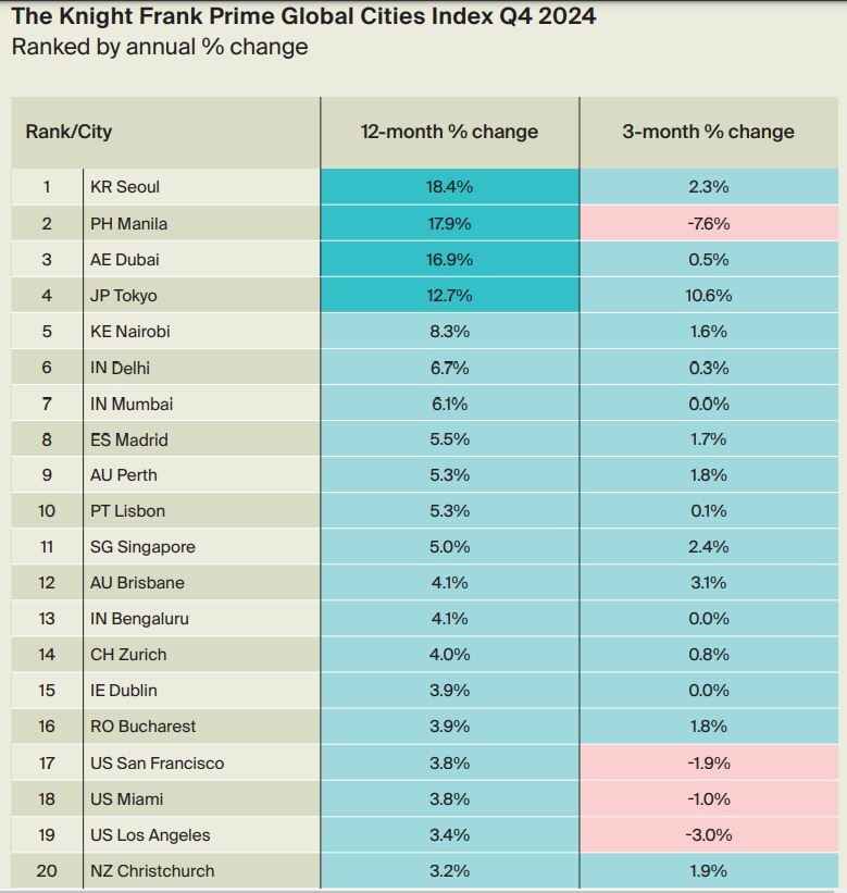 Индекс Knight Frank по итогам IV квартала 2024. Среди популярных у русскоязычных инвесторов локаций выделяется только Дубай, где за прошлый год премиальные объекты подорожали на 16,9% 🔥 В европейских и американских городах рост 5% и меньше. Для элитки это, кстати, норма.