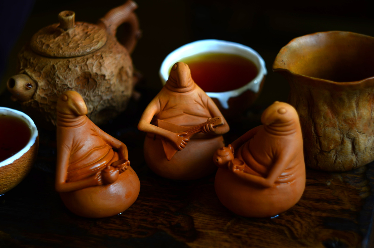 Если Вы интересовались китайской чайной церемонией, то наверняка замечали, что обычно на чайной доске присутствуют странные фигурки. Это такая традиция в китайской чайной культуре - украшать чаепитие чайными фигурками Ча Чун (茶宠cháchǒng) (кит. Чайный Товарищ, относится только к неодушевлённым предметам). Кто-то украшает свое чаепитие важными чайными и не только персонами (Лу Юй, Шэнь Нун, Будда, Хотэй, Гуаньинь, Джан Фэй и тд.), кто-то животными или мифическими существами (трехлапая жаба, дракон, а кто-то простыми, но важными лично для себя предметами. Это может быть даже камушек или красивая палка, привезенные из путешествия. Традиции Наличие подобных фигурок необходимо по китайской практике «фэн-шуй» (кит. «ветер и вода») — рекомендующей разбавлять утилитарные вещи чем-нибудь милым и красивым. Традиционно первый «технический» пролив отдается чайному духу, и когда у вас в "чахае" остаётся чай, которого не хватит на полную чашку, его льют на такую фигурку. Её угощают чаем, заодно привл