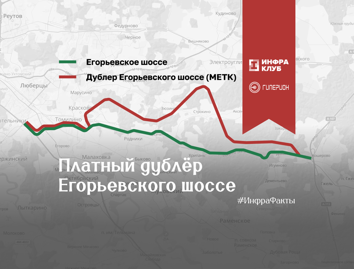 В текущем году в Подмосковье начнут строить автомобильную дорогу «Москва - Егорьевск - Тума – Касимов», которая станет платным дублёром Егорьевского шоссе. Сегодня в рубрике #ИнфраФакты расскажем о новой трассе, основных показателях, значении и перспективах проекта. 🚗 Новая дорога Четырёхполосная трасса с 9 развязками и 32 мостами протяжённостью 36,2 км будет начинаться в посёлке Томилино, пройдёт по территории Люберецкого округа, округов Котельники и Раменское и выйдет к ЦКАД рядом с селом Гжель, в итоге связав МКАД и ЦКАД на восточном направлении. Плановая интенсивность движения по новому участку – более 25 000 автомобилей в сутки. Категория дороги – 1Б, 4 полосы движения, а основная расчётная скорость – 120 км/ч. Проектная документация уже прошла этап экспертизы. 🤝 Концессионное соглашение Концессионное соглашение о создании и эксплуатации платного дублёра Егорьевского шоссе было подписано 10 декабря 2021 года. Концедентом стало Министерство транспорта и дорожной инфраструктуры Мо