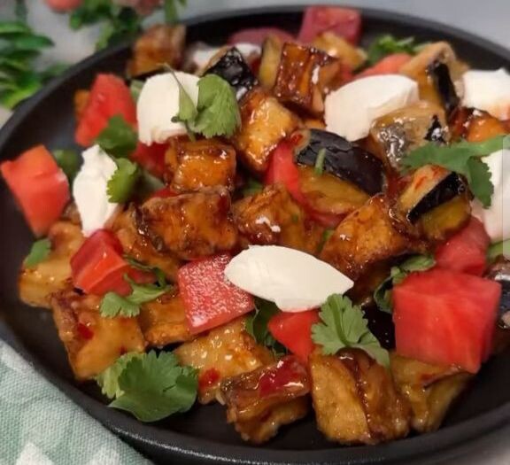 Ингредиенты: ✅ Баклажан (большой) - 1 шт. ✅ Соль - 1 ч.л. без горки. ✅ Кукурузный крахмал - 2-3 ст.л. ✅ Масло (растительное / оливковое) - для обжаривания в кастрюле. ✅ Соус «Сладкий Чили» - 2-3 ст.л. ✅ Помидор (большой) - 1шт. ✅ Зелень (кинза/петрушка) - 1 пучок. ✅ Творожный сыр - 1-2 ст.л. Нарезаем на кубики баклажан, добавляем соль и перемешиваем. Далее крахмал смешиваем с баклажанами. Отускаем кубики баклажана в кипящее масло и жарим до золотистой корочки. Выкладываем баклажаны на салфетку/полотенце. Нарезаем помидор на кубики. Шинкуем зелень. Перемешиваем кубики баклажана и соус. Красиво выкладываем «слоями»: чуть больше половины баклажанов, чуть больше половины зелени, помидоры, баклажаны, сыр, зелень. Подпишись на РЕЦЕПТЫ 🥗 Приятного аппетита 😋 #салаты #лёгкийсалат #рецептсалата #рецепты #рецептысалатов #классическийрецепт #приготовление #рецептывдомашнихусловиях #вкусныерецепты #домашниерецепты #пошаговыйрецепт #рецептусловиях #рецептысовощами #кастрюля #овощи #ба