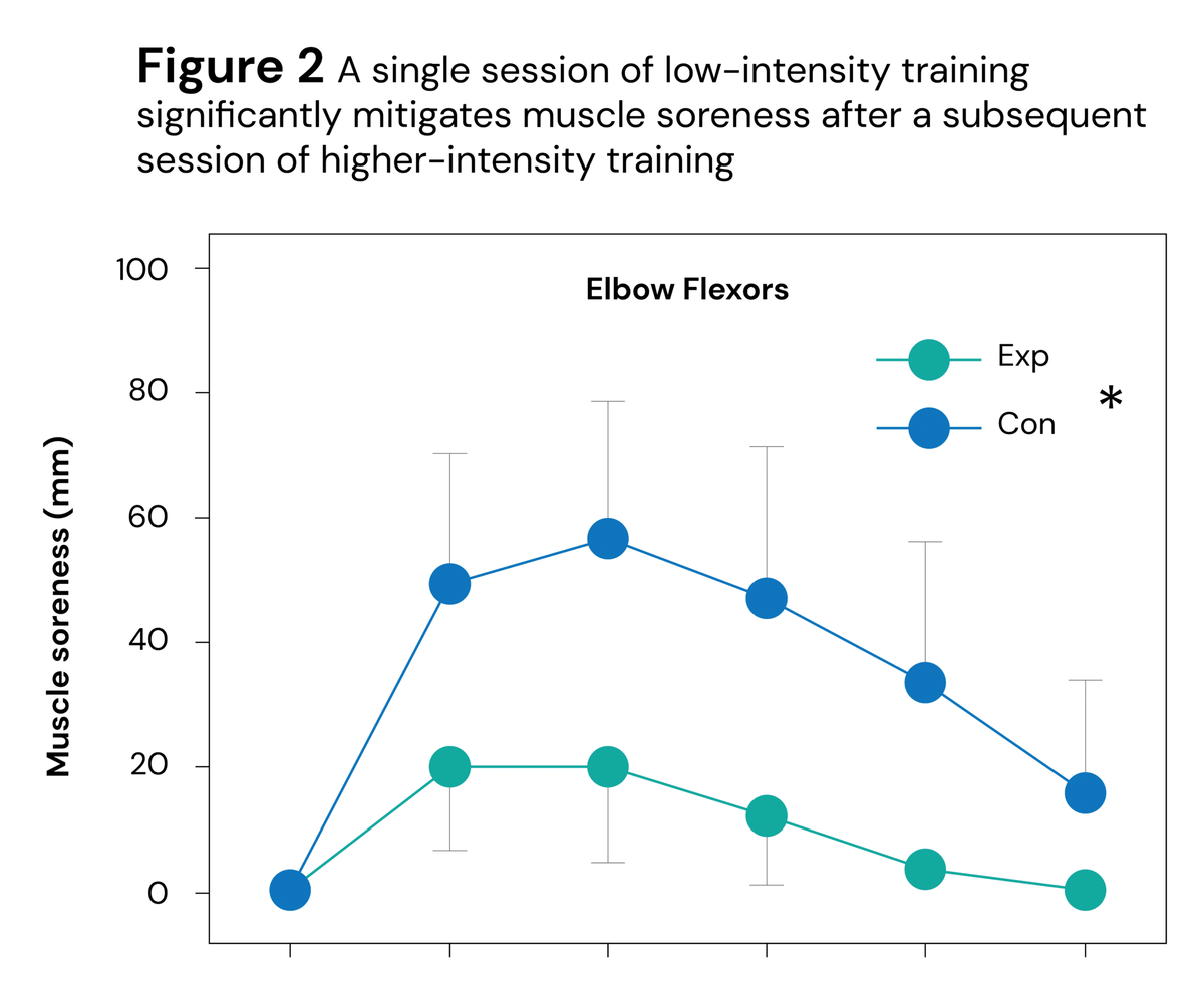 - Тезис: Эффект повторной нагрузки (меньшая болезненность при повторных тренировках) достигается даже при низком объеме и интенсивности.