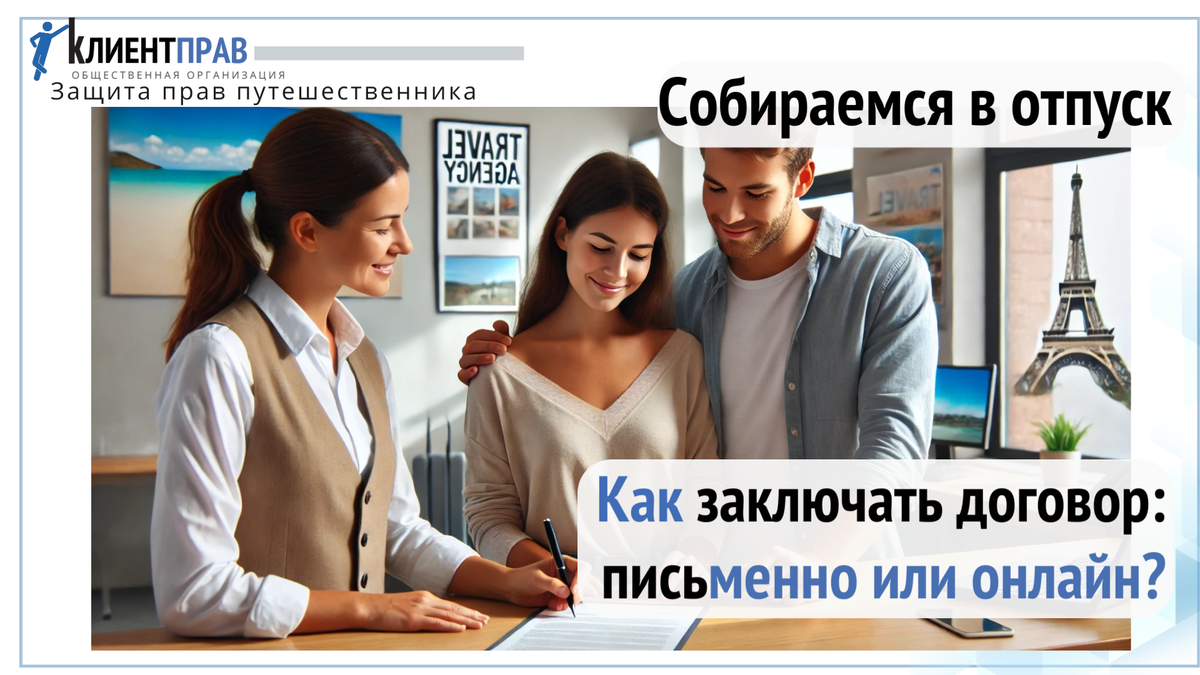 Спецпроект: Собираемся в отпуск Продолжаем собираться в отпуск вместе. Вы уже определились, у кого лучше приобретать тур: у турагента или туроператора. Теперь нужно выбрать тур и заключить договор в обычной письменной форме или в электронной. И бумажный и электронный договор на реализацию туристского продукта должны соответствовать требованиям Закона «Об основах туристкой деятельности в Российской Федерации». Есть обязательные сведения, которые должны содержаться в тексте документа: Если вы любите общаться и уточнять все тонкости будущего путешествия лично, отправляйтесь в офис и заключайте договор письменно. Вы привезете агенту необходимые документы и внесете оплату. Договор будет считаться заключенным с момента его подписания сторонами. Если вы предпочитаете онлайн-взаимодействие, то в соответствии с утвержденными правилами, турист передает туроператору или турагенту в электронной форме заявку о заключении договора, а также иные необходимые документы. Вы можете представить документ
